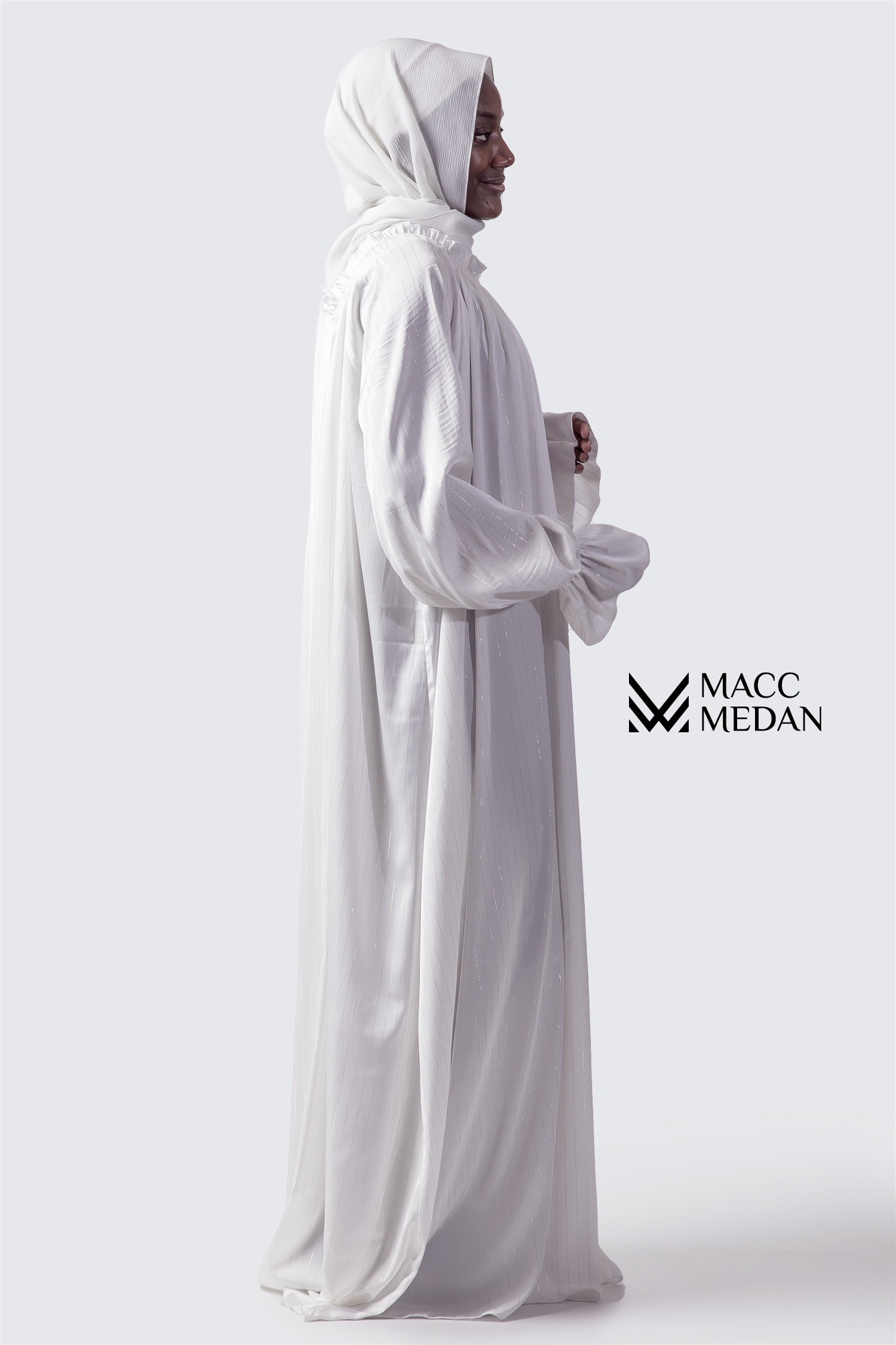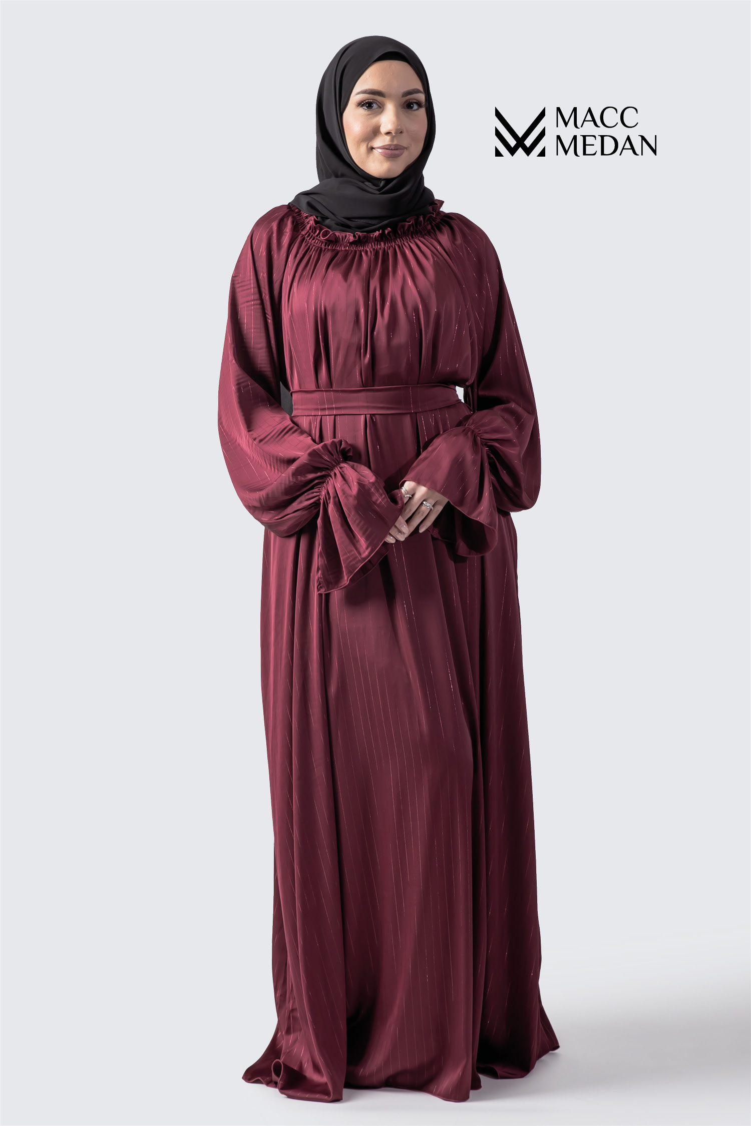 Die Abaya besticht durch kunstvolle Details: ein zarter Stehkragen mit Rüschen verleiht dem Dekolleté Struktur, während Volant-Elemente entlang der Brust und Ärmel einen verspielten Akzent setzen. Die Raglanärmel sorgen für eine weiche, fließende Schulterlinie und unterstreichen den femininen Charakter des Designs. Ein beiliegender Gurt ermöglicht es, die Taille nach Wunsch zu betonen – für wandelbare Looks von leger bis elegant.