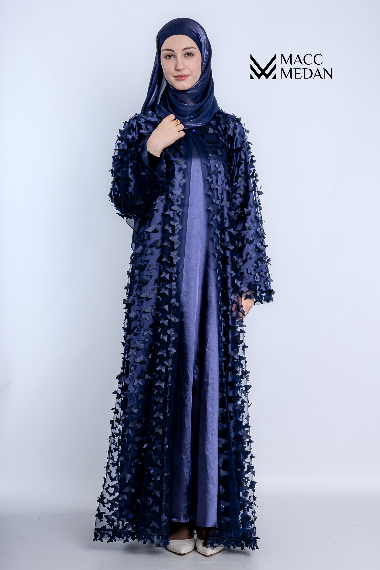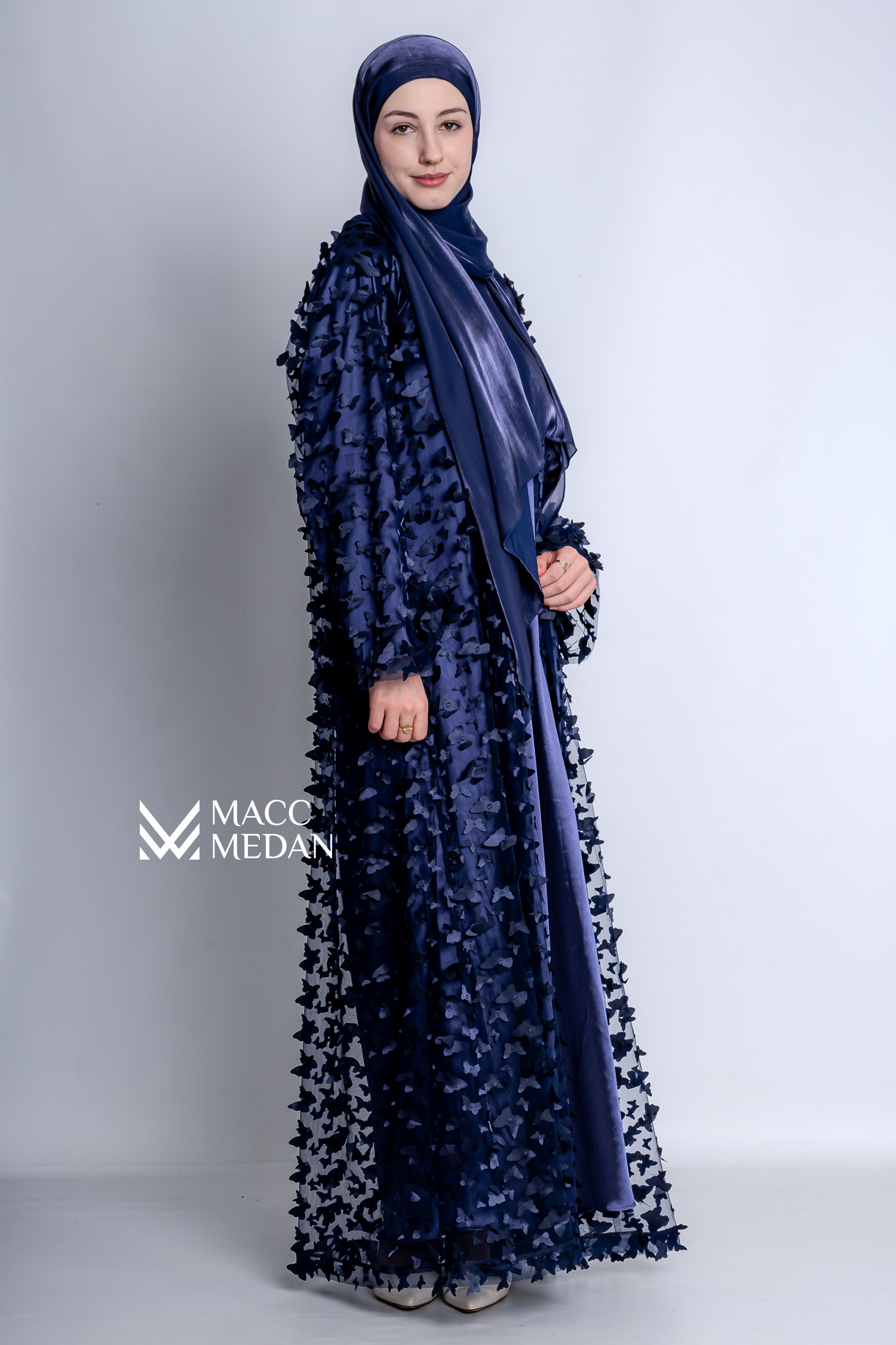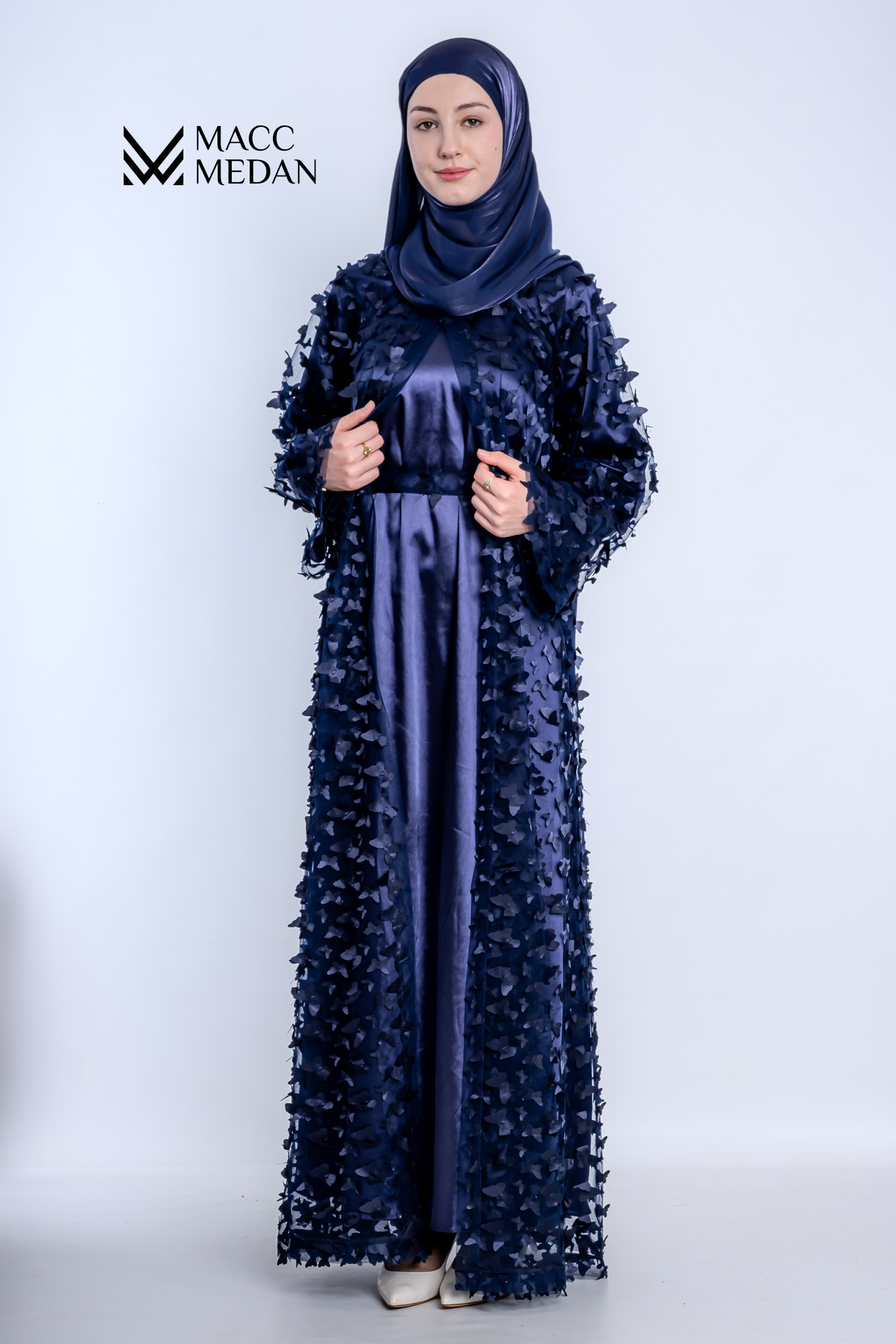 Der Abaya-Zweiteiler in Navy Elegance verkörpert pure Raffinesse und feminine Stärke. Das Ensemble besteht aus einem edel schimmernden Unterkleid und einer transparenten, strukturierten Abaya mit aufwendig applizierten 3D-Schmetterlingen. Diese einzigartige Kombination aus Glanz und Textur erzeugt eine faszinierende Tiefe, die Bewegung und Licht elegant einfängt. Die fließende Passform und die harmonische Farbgebung machen dieses Design zu einem Statement für moderne Bescheidenheit und Luxus.
