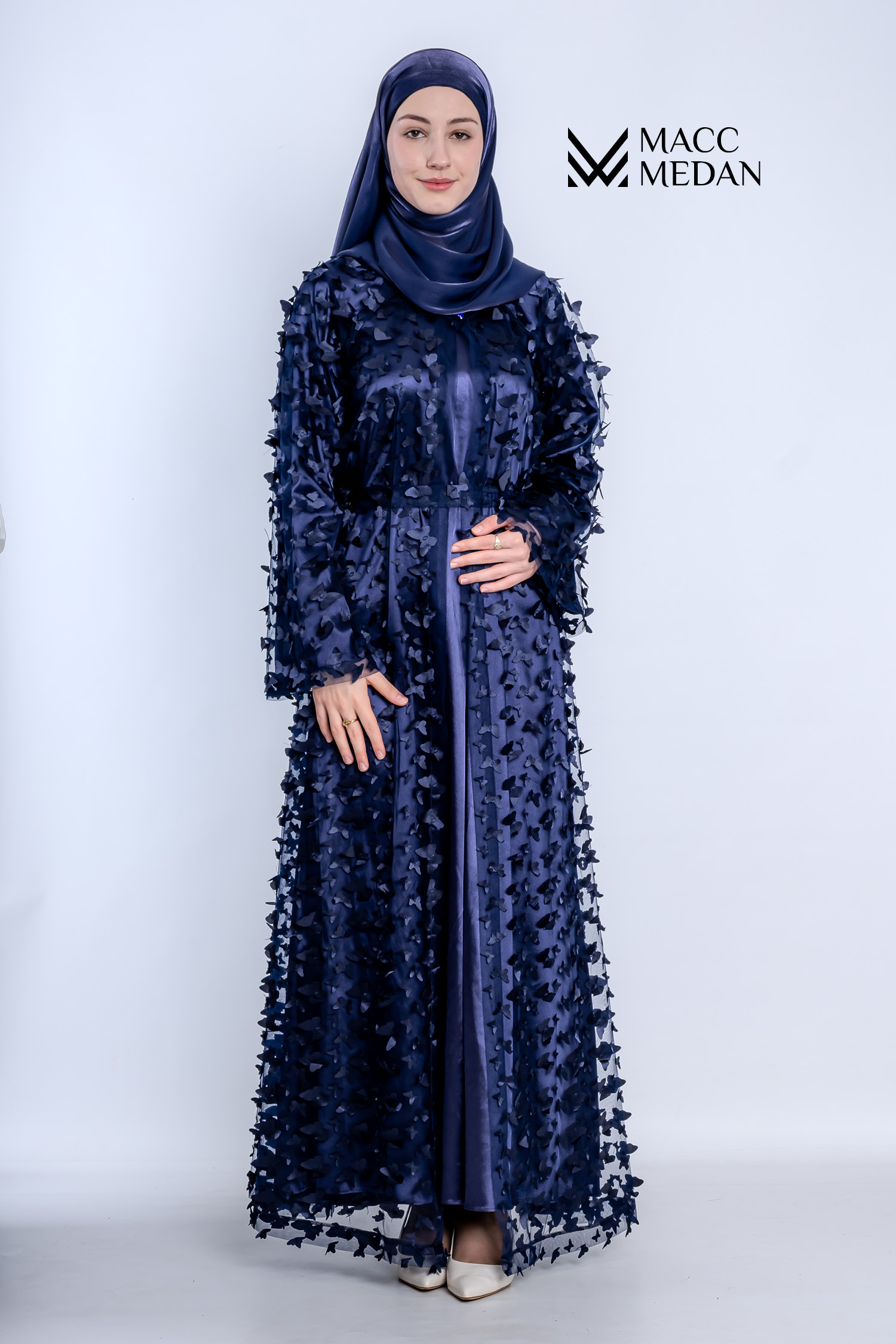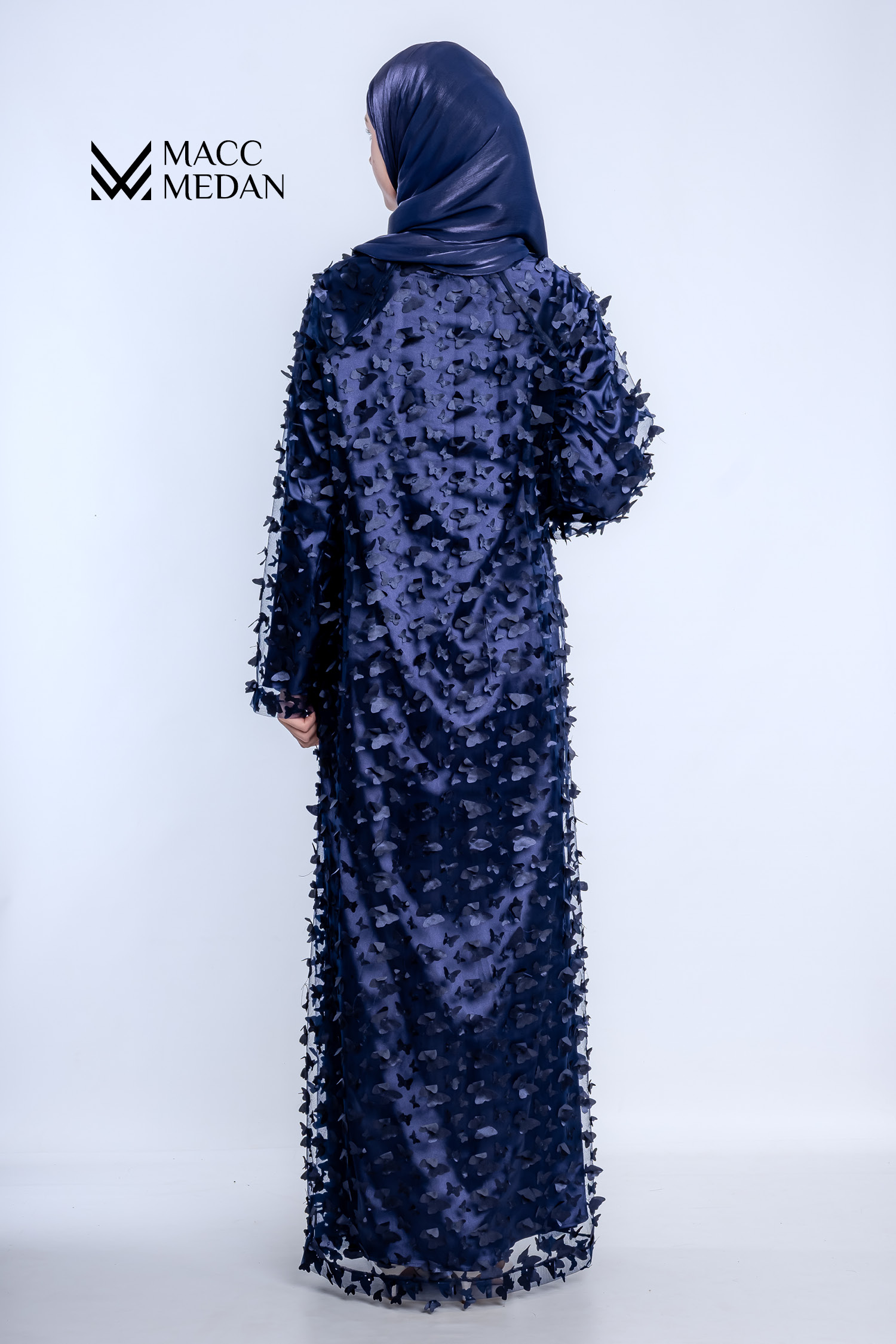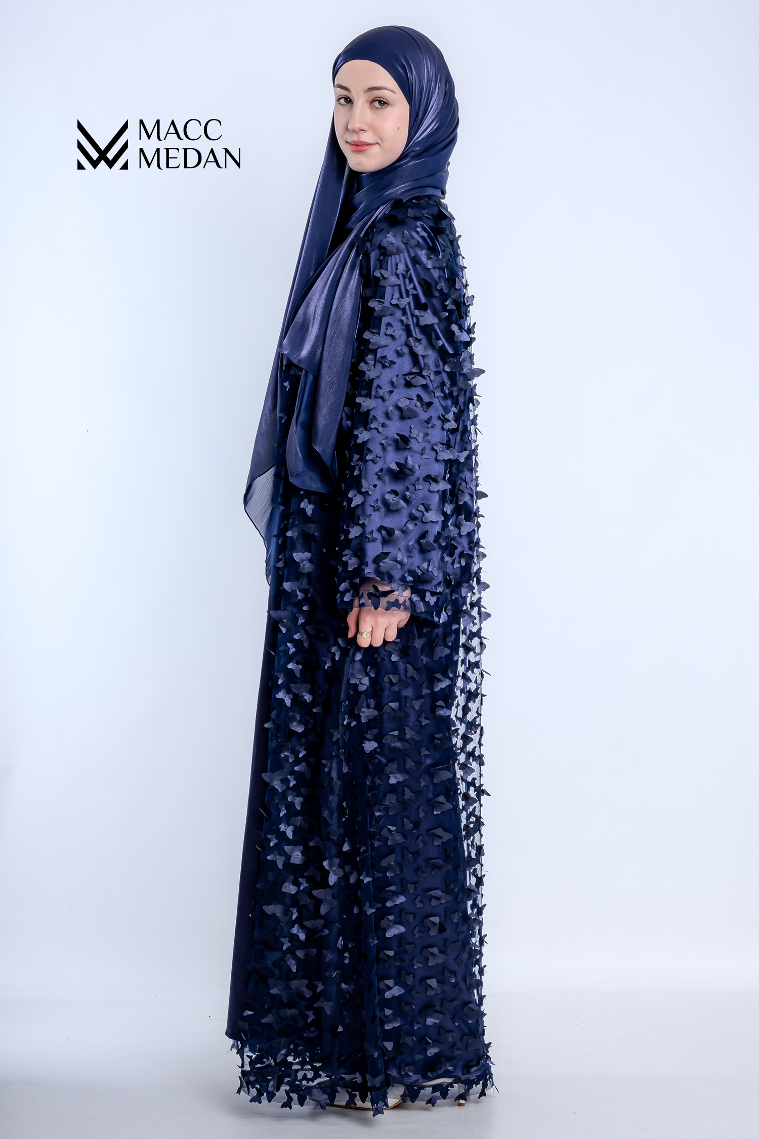 Der Abaya-Zweiteiler in Navy Elegance verkörpert pure Raffinesse und feminine Stärke. Das Ensemble besteht aus einem edel schimmernden Unterkleid und einer transparenten, strukturierten Abaya mit aufwendig applizierten 3D-Schmetterlingen. Diese einzigartige Kombination aus Glanz und Textur erzeugt eine faszinierende Tiefe, die Bewegung und Licht elegant einfängt. Die fließende Passform und die harmonische Farbgebung machen dieses Design zu einem Statement für moderne Bescheidenheit und Luxus.
