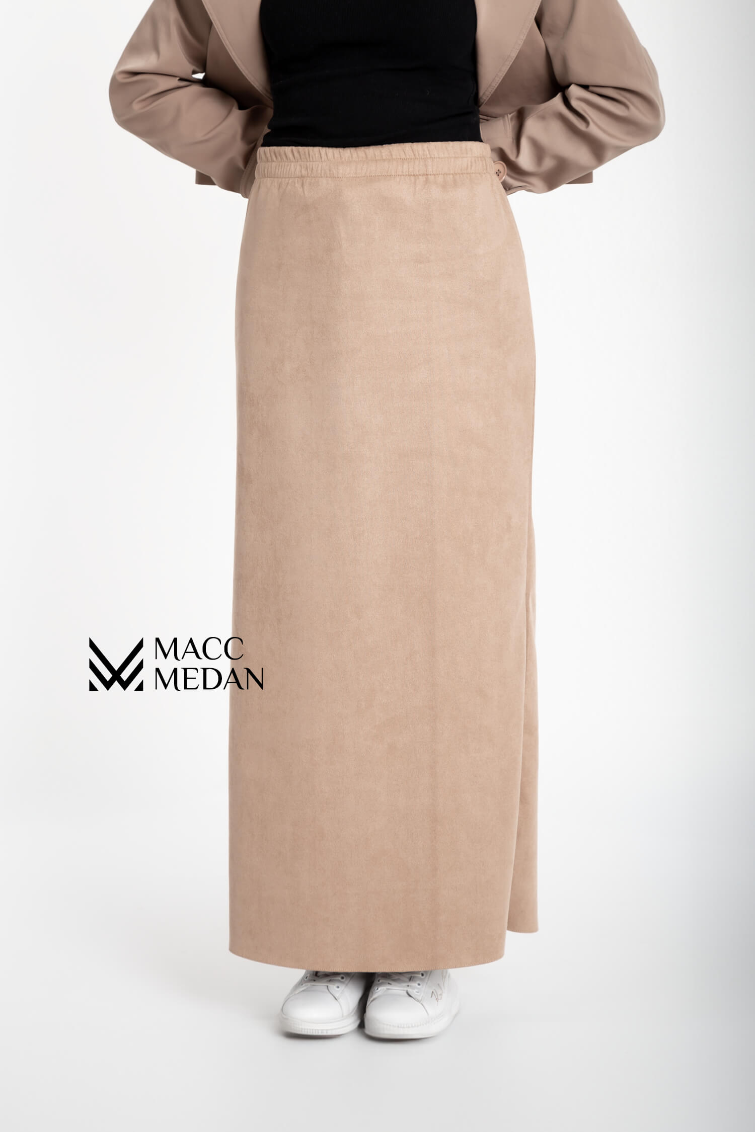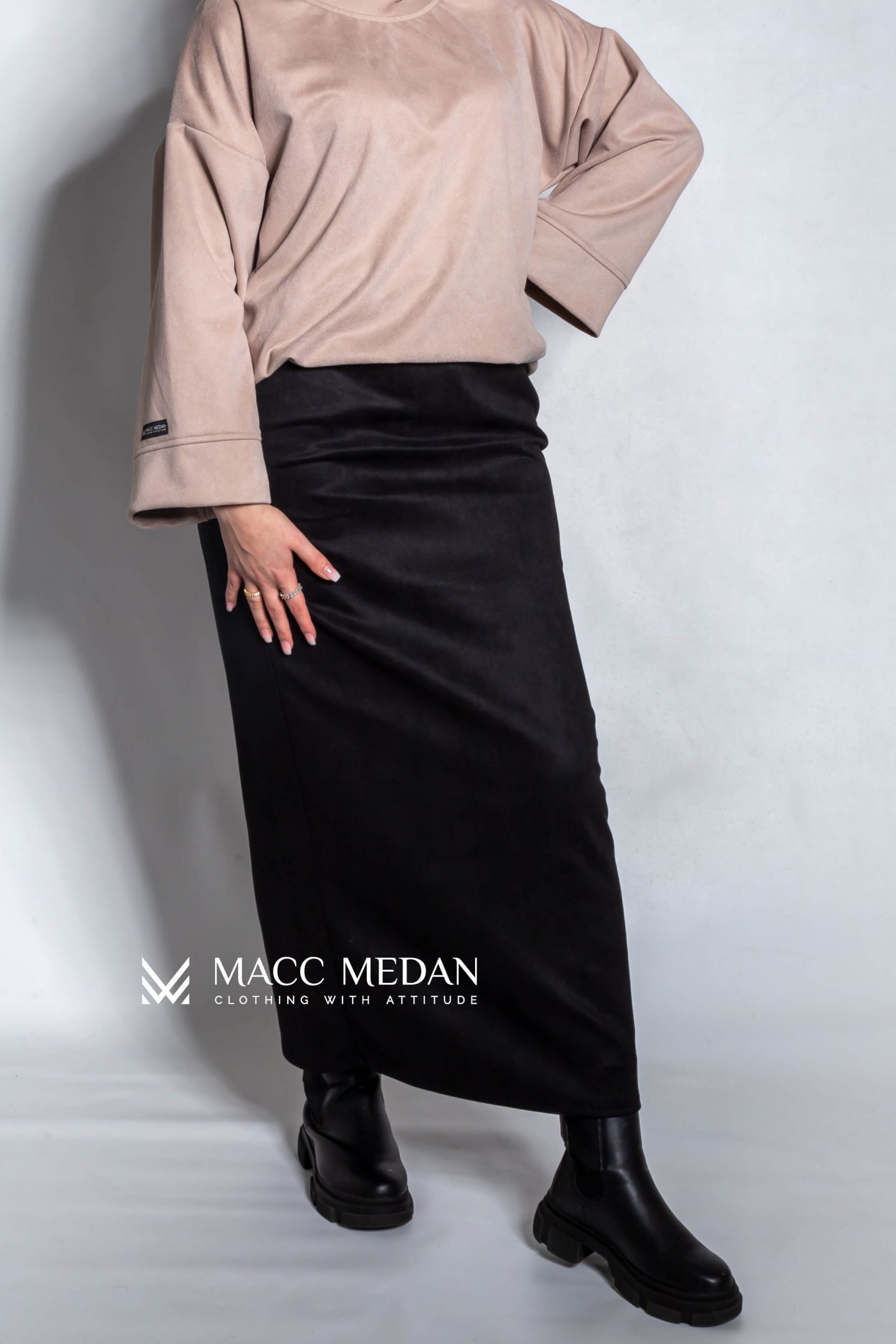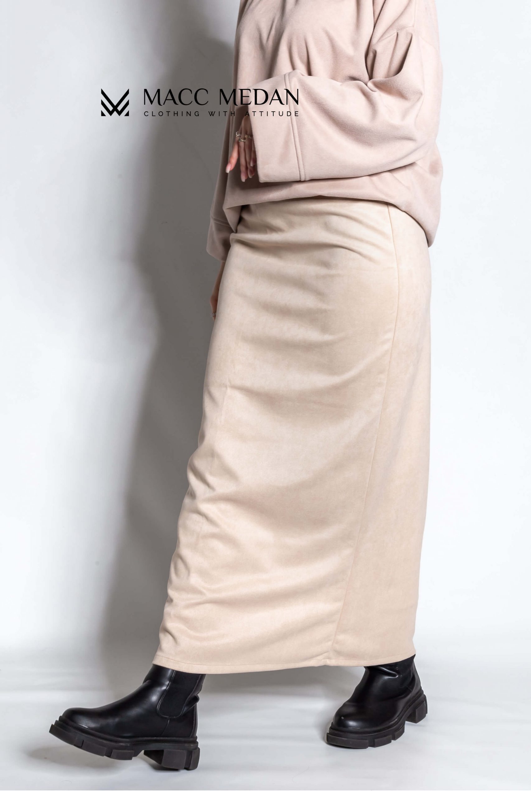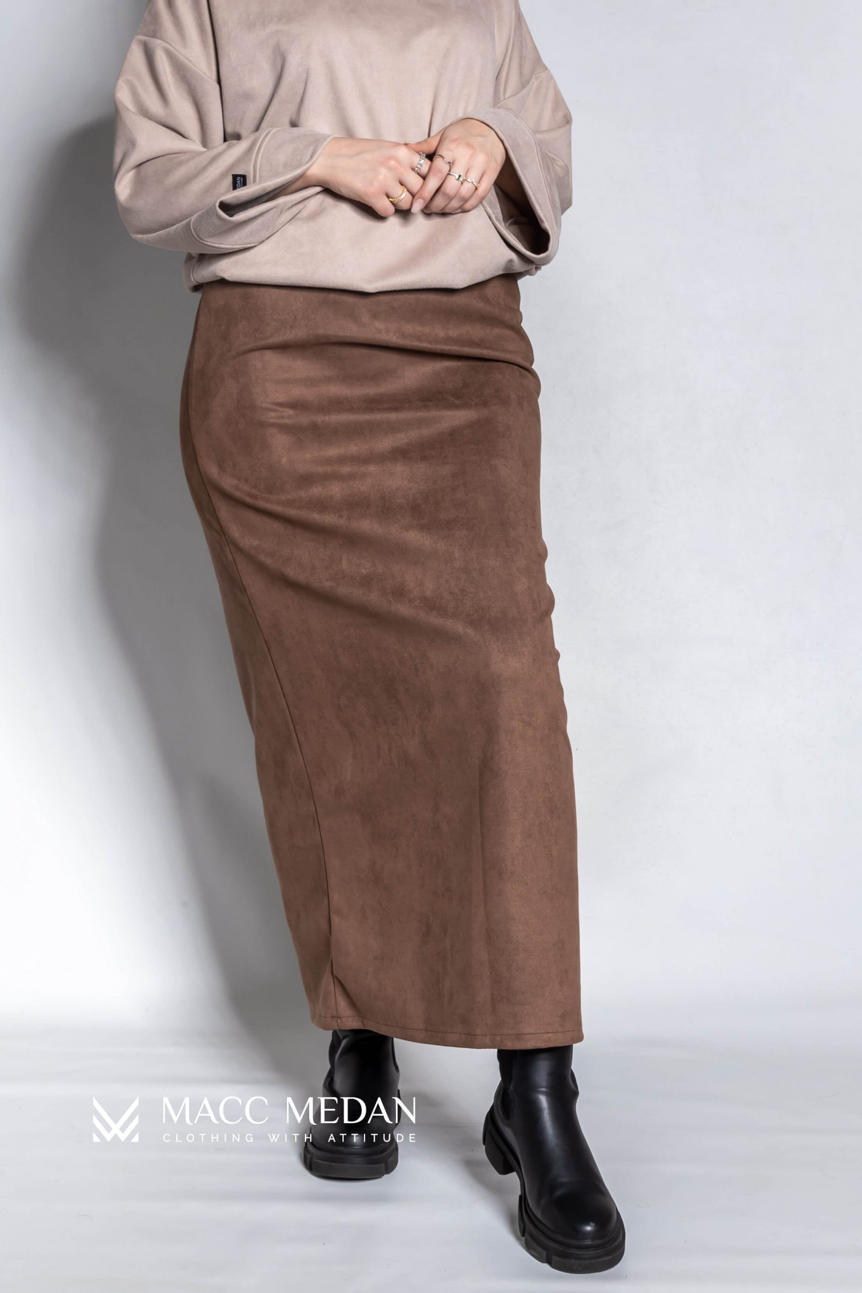 Der Rock Wildlederimmitat ist ein langer Bleistiftrock in Maxilänge, der durch seine Funktionalität und Vielseitigkeit besticht. Hergestellt aus einem angenehmen Materialmix aus 95% Nubuk und 5% Elasthan, ist dieser Rock besonders bequem und angenehm zu tragen. Der Elasthananteil erleichtert das Gehen und sorgt für eine perfekte Passform.