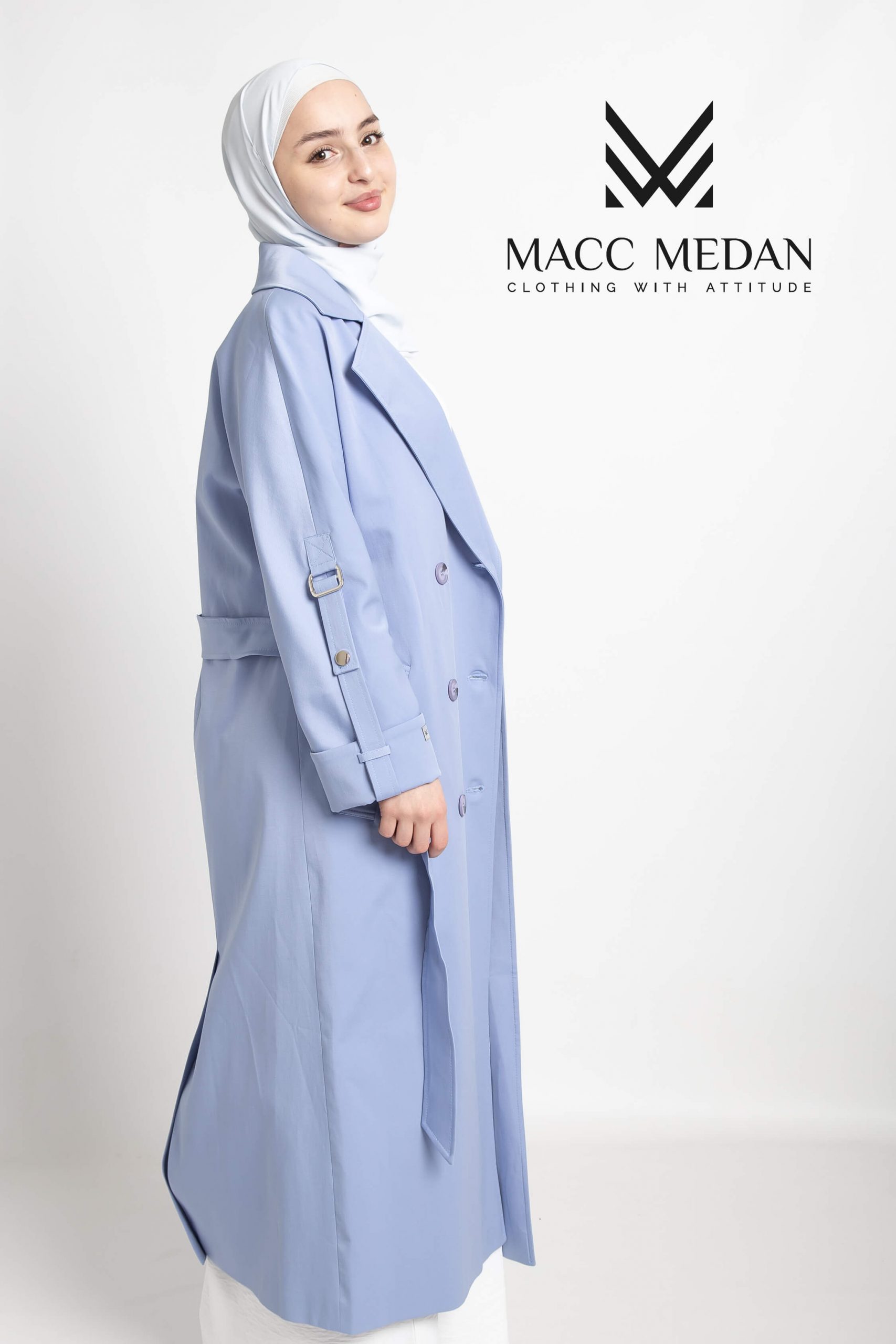 Der „Trenchcoat Premium Skyblue“ hat auch eine Maxilänge, die Ihre Beine vor Regen und Wind schützt. Die längenverstellbaren Ärmel ermöglichen es Ihnen, den Mantel an Ihre individuelle Armlänge anzupassen. Der Trenchcoat ist in den Größen 36 bis 44 erhältlich, sodass Sie ihn in Ihrer perfekten Passform tragen können.